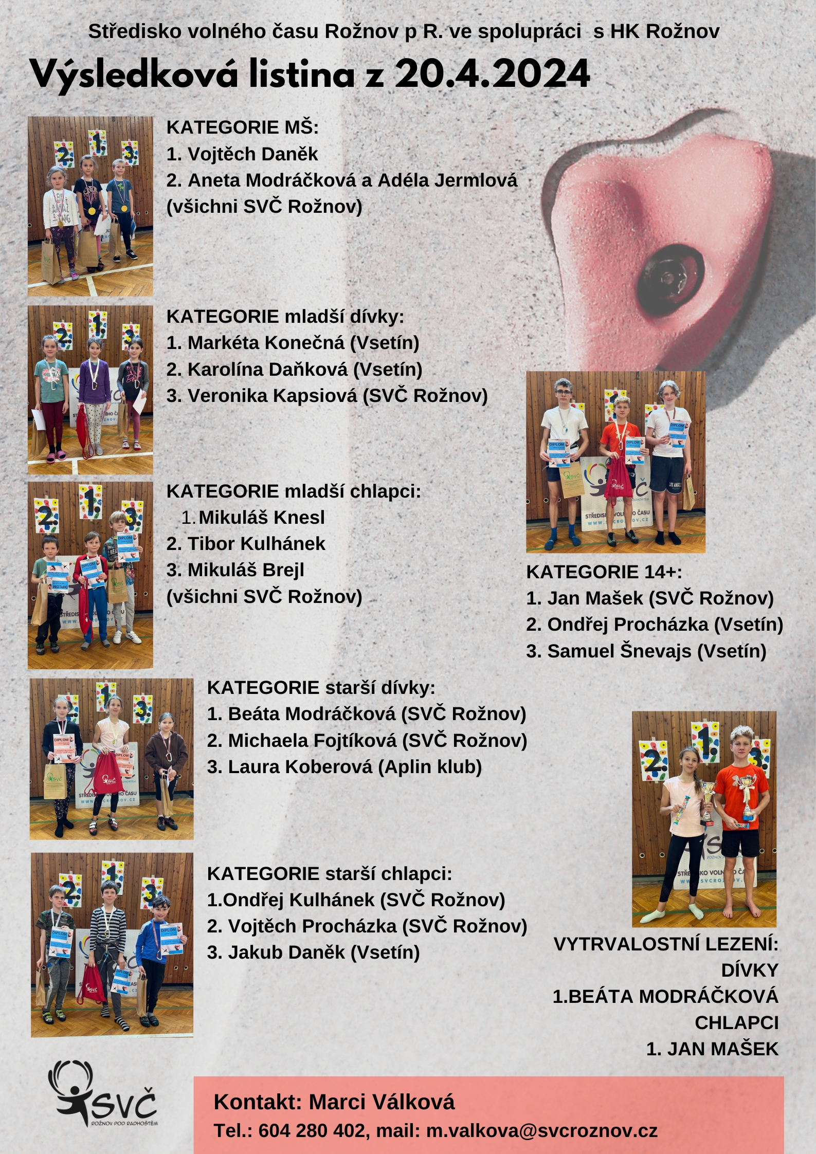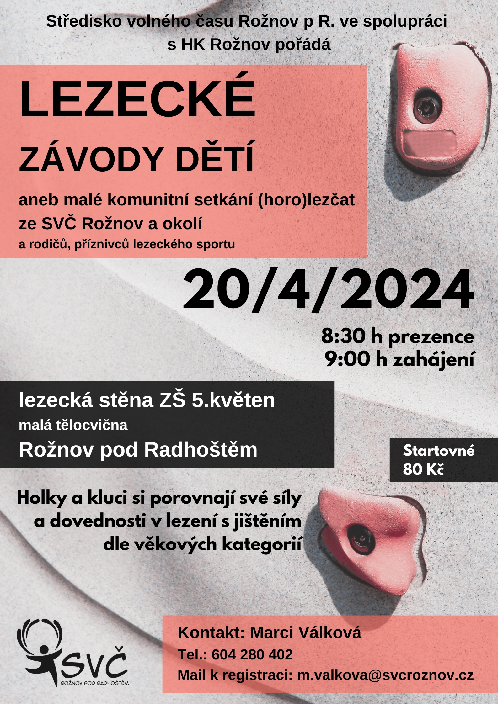 Středisko volného času ve spolupráci s HK Rožnov pořádají lezecké závody pro děti v tělocvičně ZŠ 5. Května ( mapy.cz ).