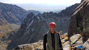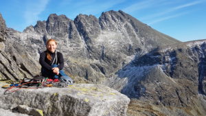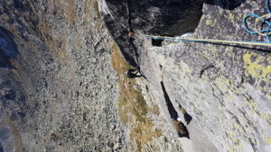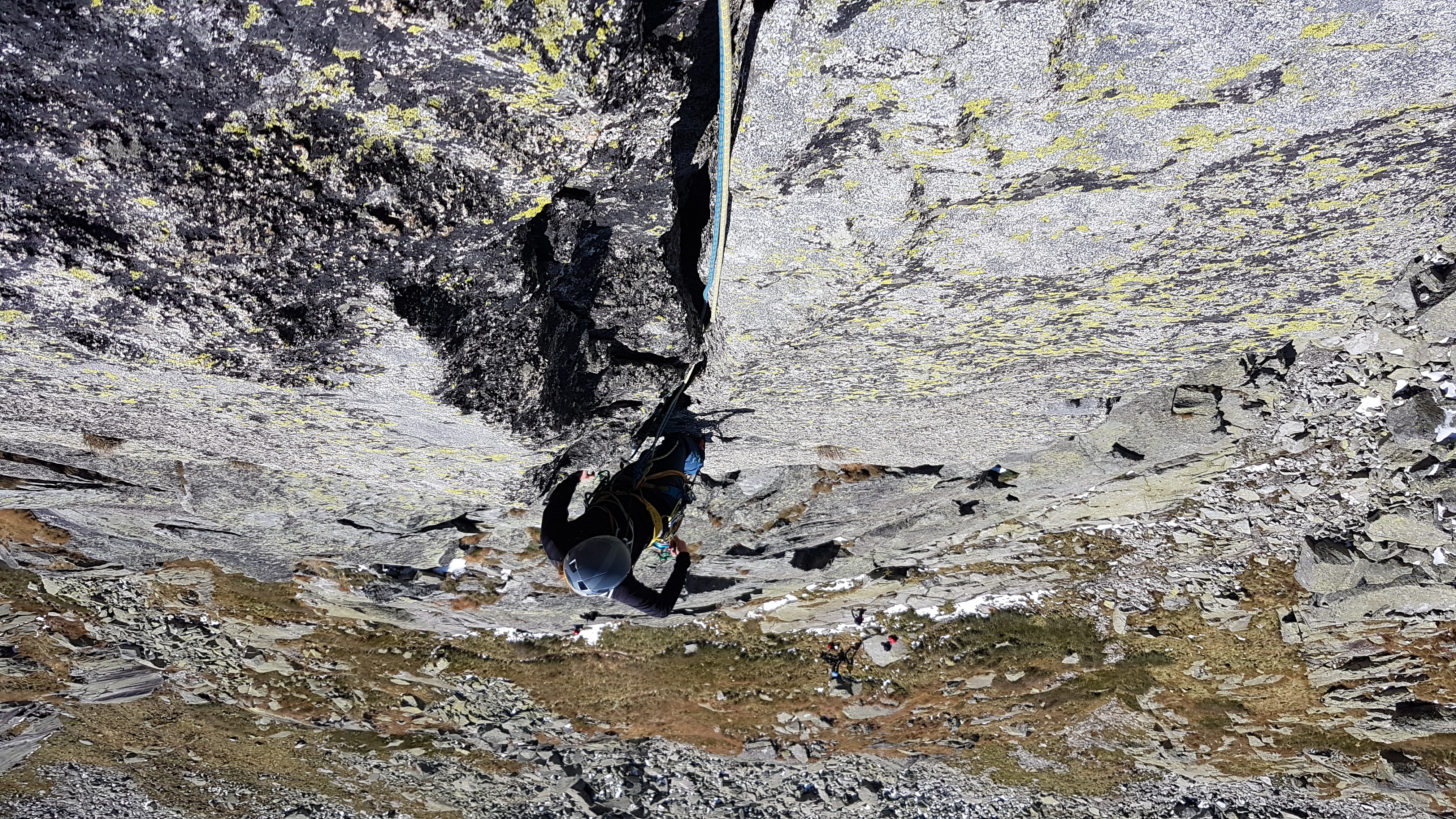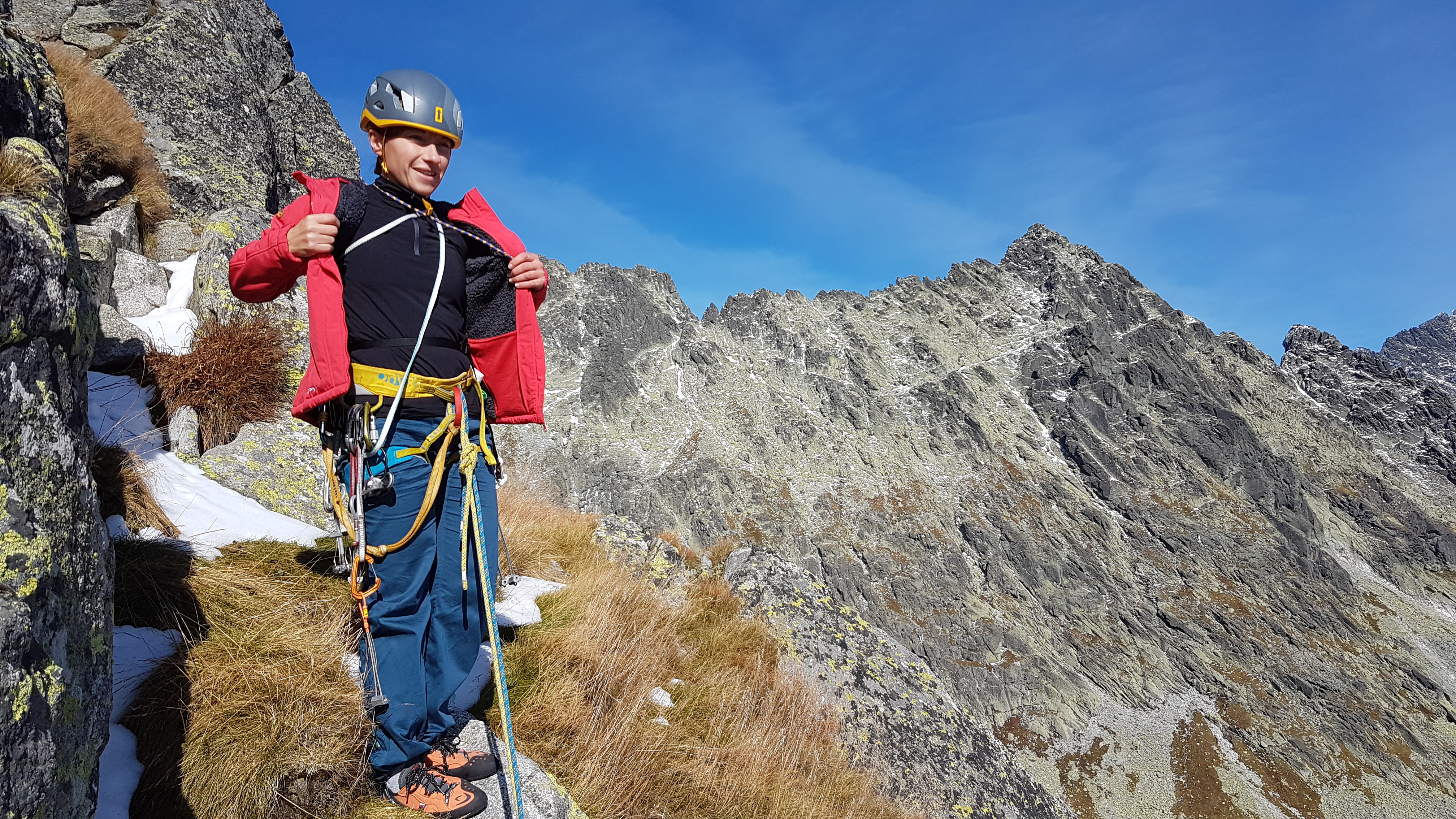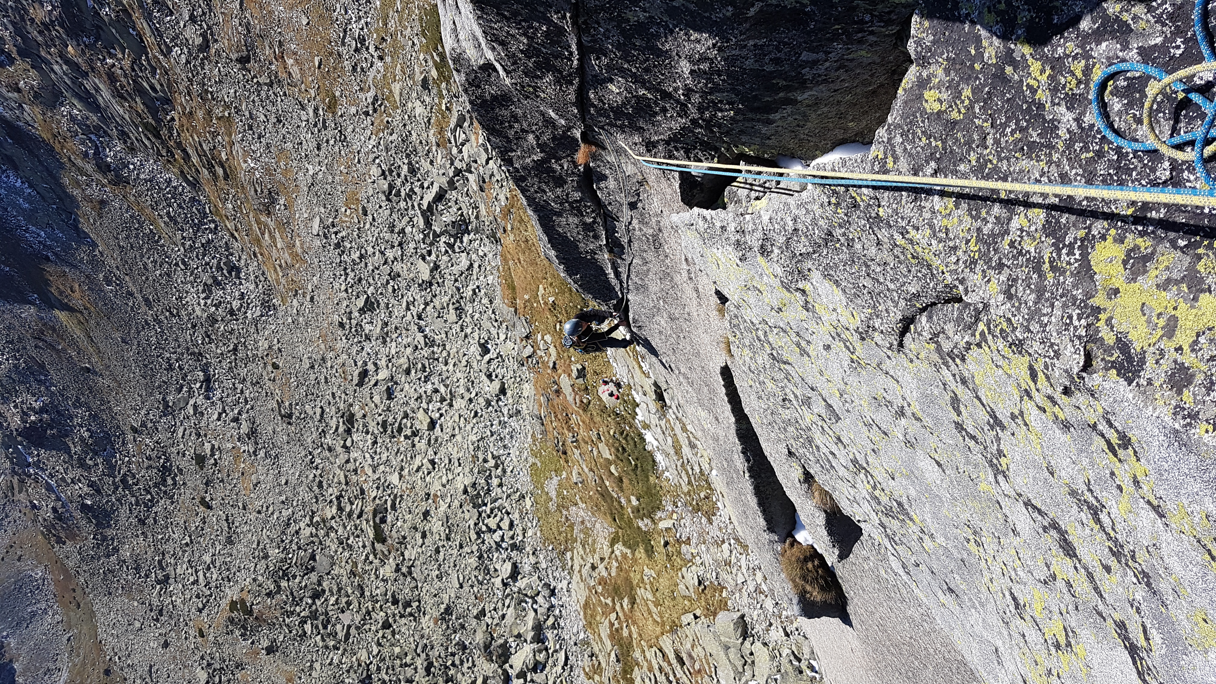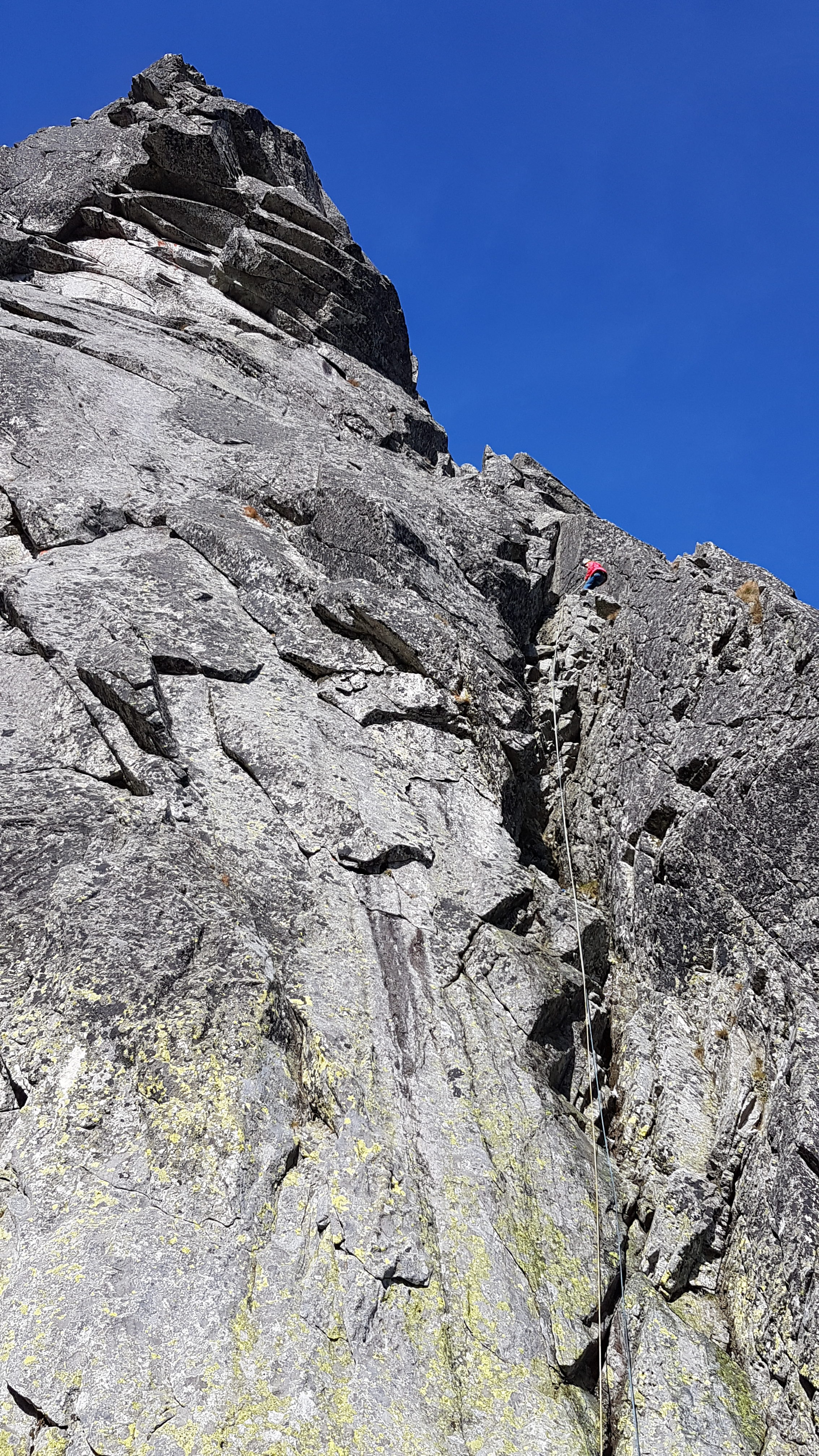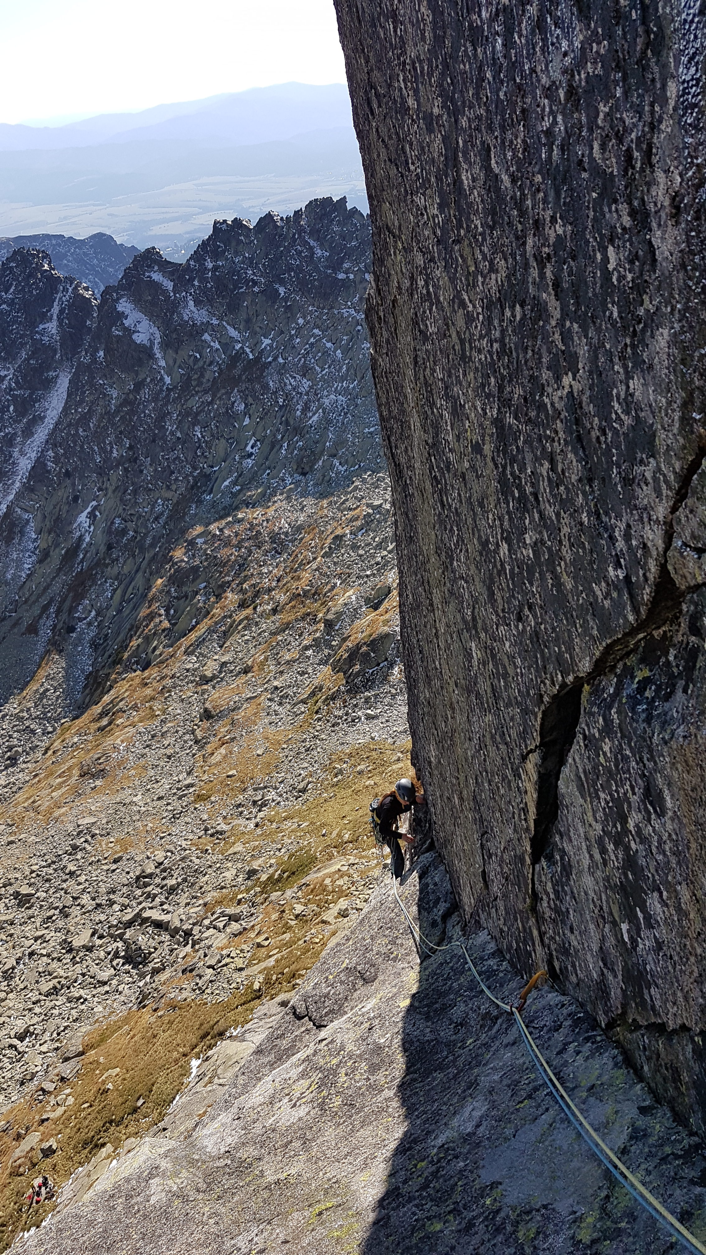 Kocháme se výhledem na Končistou a vpravo vidíme až ke Štrbskému plesu. Přicházející hlad končí naše rozjímání, slaňujeme trojkovým sestupovým komínem, kde je hromada nových borháků. Cestou dolů zdravíme mokré Polské bratry, naštěstí komínem vody už tolik neteče, tak nepotřebujeme ploutve 🙂